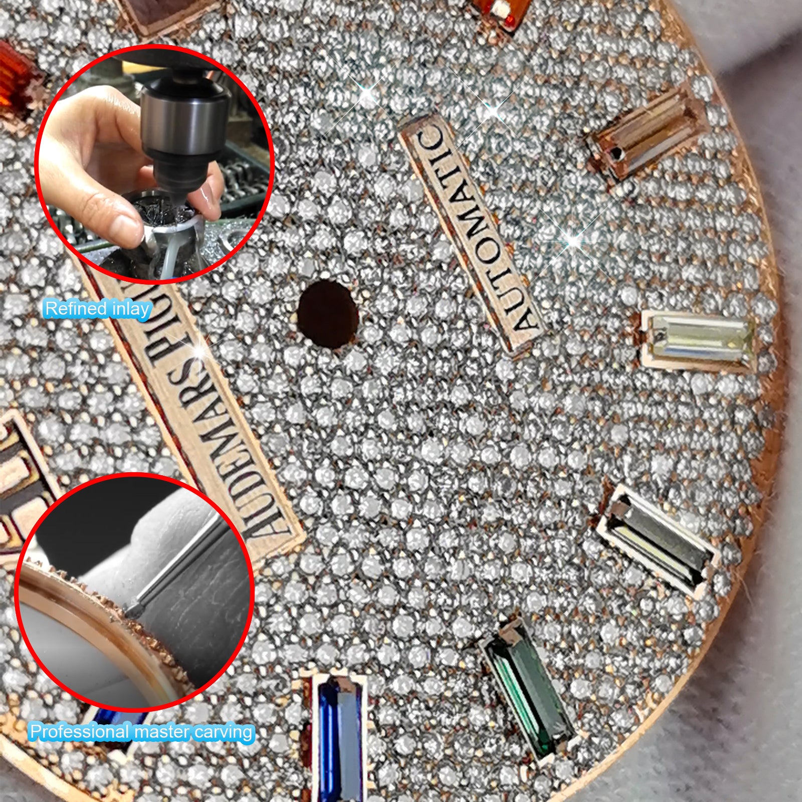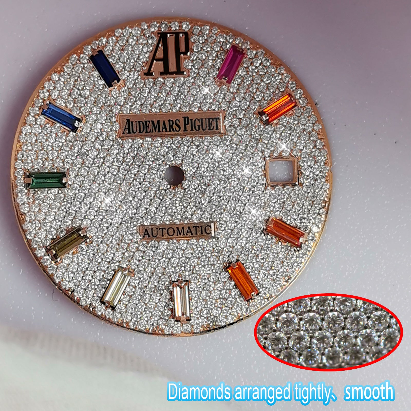 1. Compatible with Audemars Piguet Royal Oak watch Dial is inlaid with natural diamond,110 diamonds,1.12CT.(you can choose cubic zircon、 moissanite diamond、lab-grown diamond, natural diamond, other gemstones)